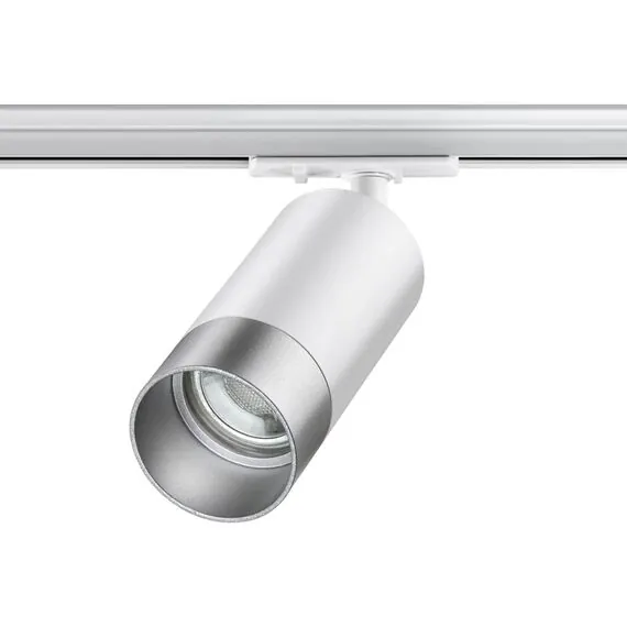 Светильник трековый для однофазного двухжильного (универсального) шинопровода. В корпусе светильника есть акриловые части, поэтому его используют только с LED лампой max.9Вт.